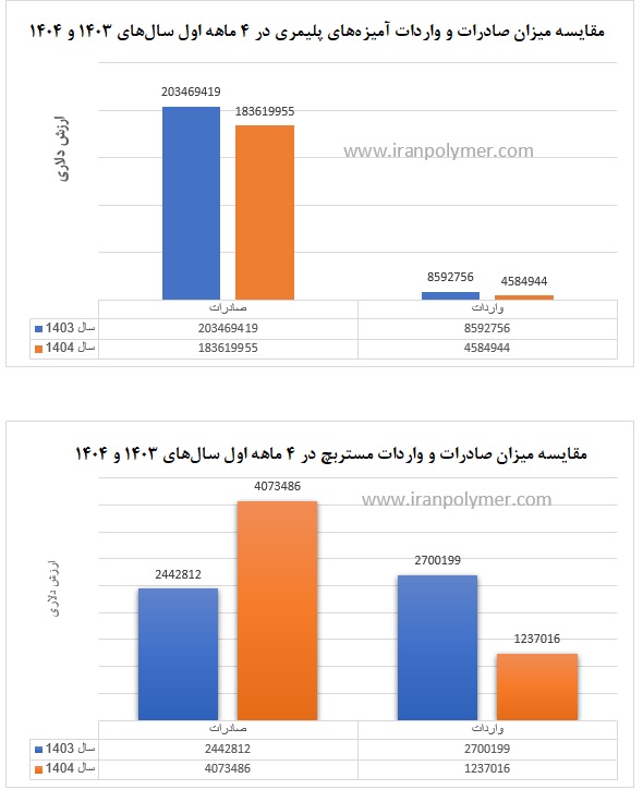 در بخش آمیزههای پلیمری نیز روند واردات کاهشی بوده است. در چهار ماهه نخست ۱۴۰۳، واردات این محصول به بیش از ۳.۲ میلیون کیلوگرم و ۸.۵ میلیون دلار رسید. اما در سال ۱۴۰۴ حجم واردات تقریباً نصف شد و به حدود ۱.۴۵ میلیون کیلوگرم و ۴.۵۸ میلیون دلار رسید. افت ۵۶ درصدی در وزن و ۴۷ درصدی در ارزش دلاری نشان میدهد که یا بازار داخل بیشتر متکی به تولید داخلی شده یا کاهش تقاضا در صنایع مصرفکننده اتفاق افتاده است.