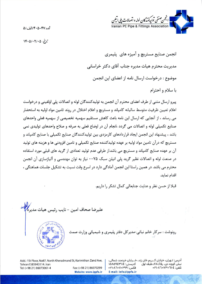 نامه انجمن تولیدکنندگان لوله و اتصالات PE به انجمن تولیدکنندگان مستربچ و کامپاند: راهکاری برای ارتقای همکاری