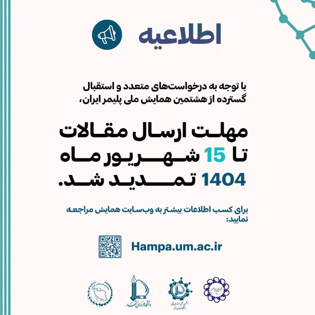 بسپار/ایران پلیمر دبیرخانه هشتمین همایش همپا اعلام کرد که مهلت ارسال مقالات به هشتمین همایش ملی پلیمر ایران تا تاریخ ۱۵ شهریور ۱۴۰۴ تمدید شده است.