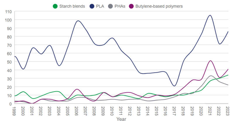 The report shows that bioplastic packaging patent filings rose from 306 in 2022 to 335 in 2023, reversing part of a 30% drop seen the previous year.